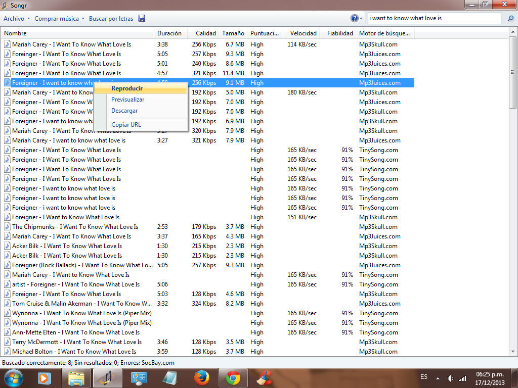 Hecho eso mostrará los resultados dan click derecho a la canción, según sus exigencias de calidad, y mostrara mas opciones como, reproducir (utilizará el reproductor de windows para eso), descargar, etc.