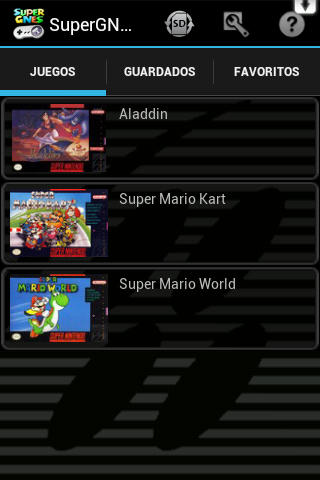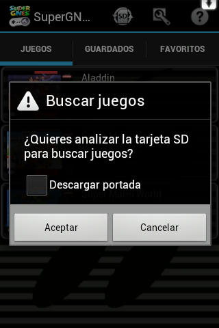 Ya copiado y pegado el juego que descargaron. Abren la aplicación Super GNES y pulsan el icono de la tarjeta SD (empezará a escanear los juegos en su android).