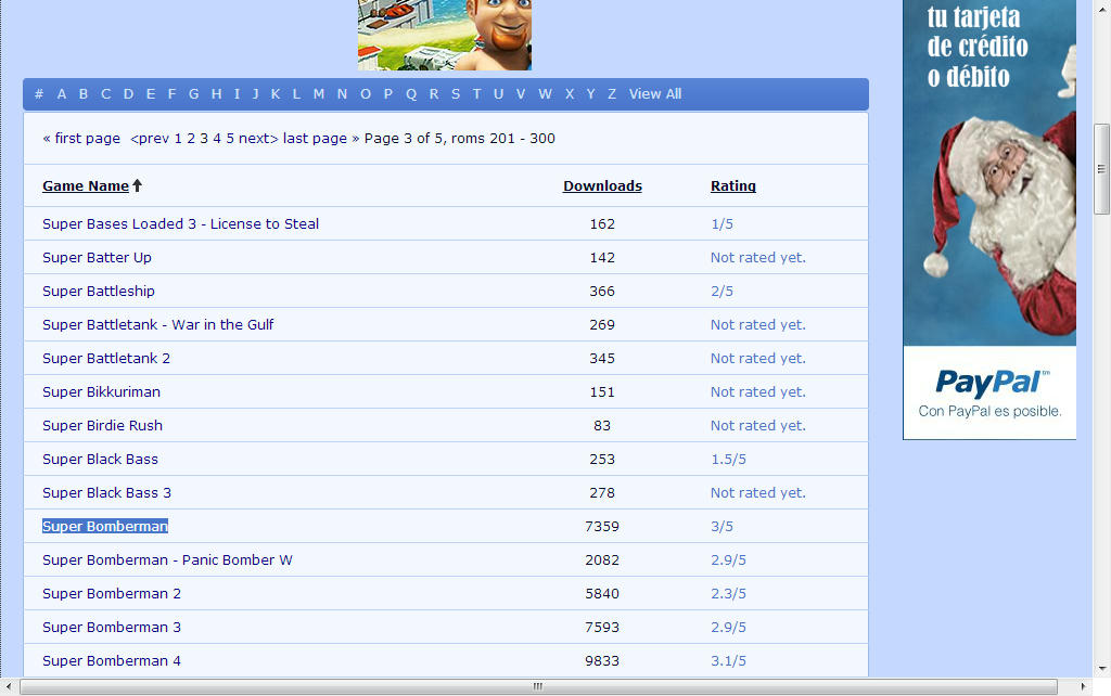 Una vez redirigos a la pagina de descarga de juegos buscan su juego por la letra que empieza en este caso descargaré, Super Bomberman, así que iré a la letra "S". Una vez encontrado nuestro juego damos click al nombre.