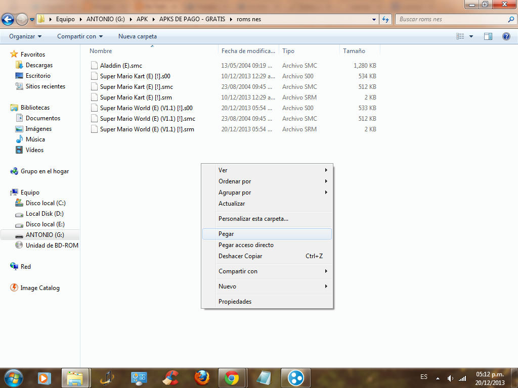 Y pegamos el archivo .smc en nuestra carpeta Roms NES, o el nombre que le hayan puesto a la carpeta que mencione que crearan en su Android. Y lo pegan.