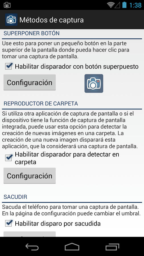 Hola a todos, bien hace tiempo un visitante de la página me dijo que publicara una aplicación para capturar la pantalla de su Android, bueno estuve buscando en todo este tiempo que paso y existían varias aplicaciones, unas requerían root otras no pero, la que realmente me convenció fue esta aplicación Screenshot Ultimate Pro, que ademas de capturar tu pantalla permite editar también el espacio que quieres capturar, si no quieres capturar toda la pantalla en si, ademas te permite guardar la imagen en distintos formatos, ya sea .png, .jpg, entre otros, ademas de eligir la carpeta donde quieras que vayan tus capturas, entre otras muchas cosas mas, una aplicación muy completa y con un peso relativamente pequeño y que es esencial en cualquier Android. Bien sin mas que decir se los dejo.