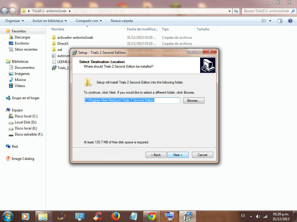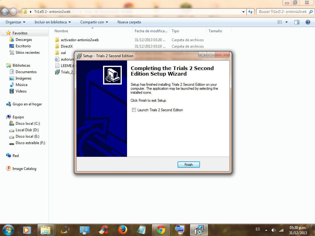 Ya instalado, desmarca la casilla Launch Trials 2 Second Edition, y no ejecutes el juego aun.
