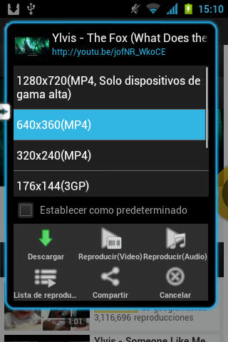 En mi caso lo descargue, solo seleccionan la calidad de vídeo de acuerdo a la potencia de su Android, yo elegí 640x360 en formato MP4, pulsan el icono DESCARGAR.